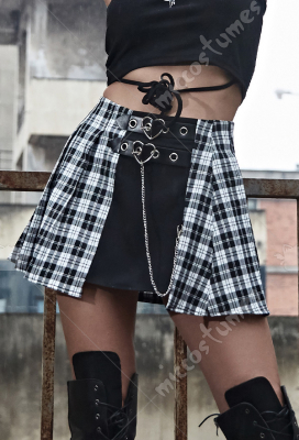 Woman Cute Harajuku Sweet Style Grid Pattern Spliced Leather Buckle and Waist Chain Decorated HIgh Waist Skirt Costume Outfit