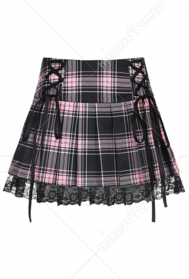 Woman Cute Harajuku Rock Style Grid Pattern Lace Decorated Tie-Front Belt Pendant Short Type Skirt Costume Outfit