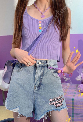 Woman Casual Cute High Waist Stretchy Denim Jean Shorts with Lace And Hang Decorations