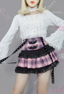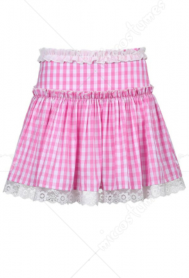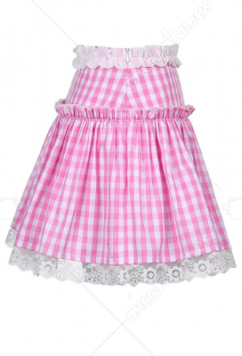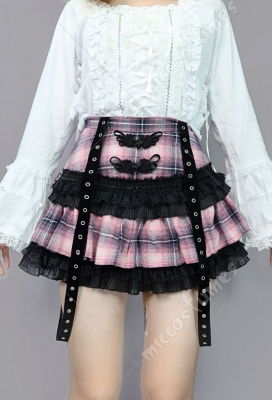 Woman Cute Harajuku Sweet Style Waist Adjustable Grid Pattern Lace Decorated Spliced High Waist Skirt Costume Outfit