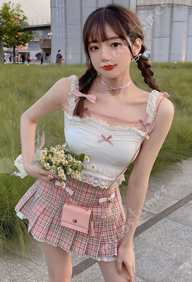 Woman Cute Harajuku Sweet Style Sleeveless Backless Grid Pattern Sailor Collar Dimensional Bow Decorated Vest Top Costume Outfit