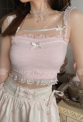 Woman Sexy Color Contrast Lace Decorated Sleeveless Spaghetti Strap Top Cosplay Costume Outfit
