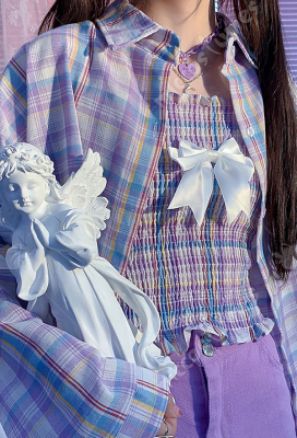 Woman Long Sleeve Collar Button Down Plaid Shirt Blouse Tops And Shapewear Camisole with Bow-knot