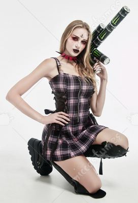 Woman Cute Plaid Pattern Drawstring Adjusted Zipper-Worn Suspender Dress Cosplay Costume Outfit