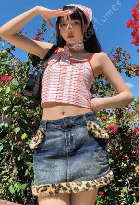 Woman Cute Leopard Pattern Spliced Furry Decorated Denim Skirt Cosplay Costume Outfit