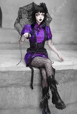 Woman Gothic Purple Butterfly Pattern Cheongsam Style Belt Lace Decorated Short Sleeved Dress Cosplay Costume Outfit