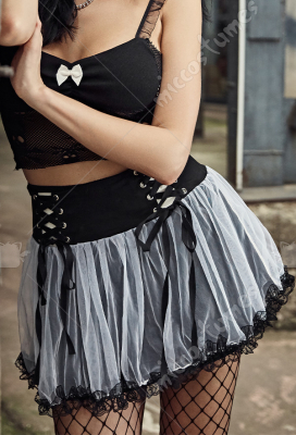 Woman Sexy Cute Tie-Front Strapped Net Yarn Spliced Color Contrast High Waist Lace Decorated Multiple Layer Skirt Costume Outfit for Spring
