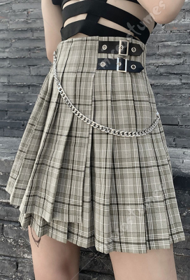 Woman Sexy Cute JK Japanese School Uniform Skirt High Waist Workwear Style Grid Pattern A-Shape Waist Chain Decorated Short Pleated Skirt Costume Outfit