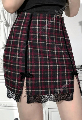 Woman Sexy Cute Sweet Style Lace Decorated Spliced A-Shape Buckle-Worn Grid Pattern High-Slit Skirt Costume Outfit