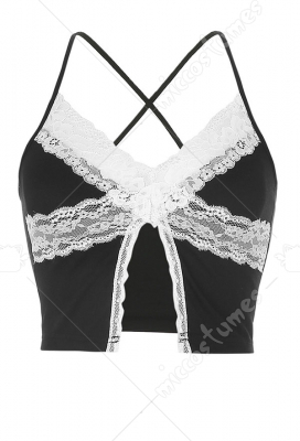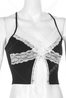 Woman Sexy Cute Fashionable Back-Crossing Strapped Lace Decorated Front-Slit Spliced Lingerie Vest Costume Outfit for Autumn