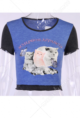 Woman Sexy Cute Round Collar Cats and Butterfly Pattern Short Sleeved Breasted Hem Cotton T-Shirt Top Costume Outfit for Summer