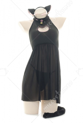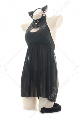 Woman Sexy Cute Semi-Permeable Chest-Open Chiffon Sleeveless Cat Pattern Bell-Decorated Maid Girls Strapped Halter Nightdress Homewear Pajama Sleepwear Underwear Costume Outfits with Cat Ear Hairband Tail Wristband