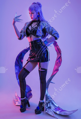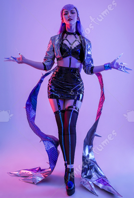 League of Legends LOL Girls New Skin Evelynn K/DA ALL OUT Idol Gradient Mixed Purple Color Shiny Symphony Laser Reflective Leather Cosplay Costume Outfit with Bracelet and Ankle Ring