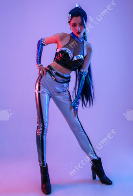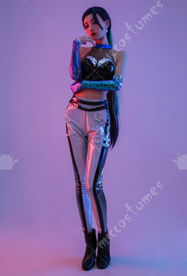 League of Legends LOL Girls New Skin Kai'Sa K/DA ALL OUT Gradient Mixed Dark Blue Color Shiny Symphony Laser Reflective Leather Cosplay Costume Full Set with Arm Protector and Long Glove