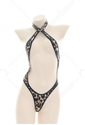 Woman Sexy Cute Japanese Style Chest-Open Leopard Pattern Halter High Split Bodysuit Private Underwear Pajama Sleepwear Outfit Costume