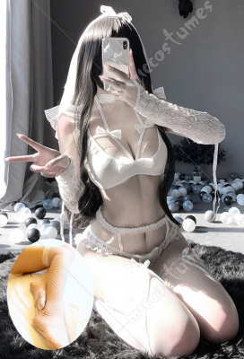 Woman Sexy Cute Vintage Wedding Bride Style Lace Tie-Back Three-Point Bikini Set Costume Outfits Homewear Underwear Sleepwear Pajama with Lace-Decorated Net Yarn Pattern Stockings Veil Gloves Leg Rings