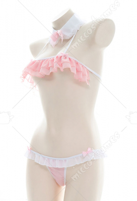 Women Cute Floral Pattern Pink Bow Decorated Sexy Three Point Bikini Lingerie Set Costume Outfit