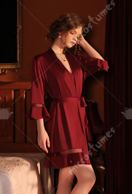 Women Deep V Floweral Pattern Decorated Pink Kimono with Cute Bow Decorated Corset