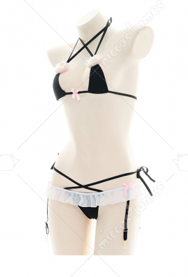 Women Cute Style Ruffle Bow Decorated Sexy Halter Maid Bikini Lingerie Set Cosplay Costume Outfits with Leg Ring