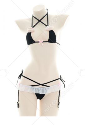 Women Cute Style Ruffle Cat Paw Decorated Sexy Halter Maid Bikini Lingerie Set Cosplay Costume Outfits with Garter Belt
