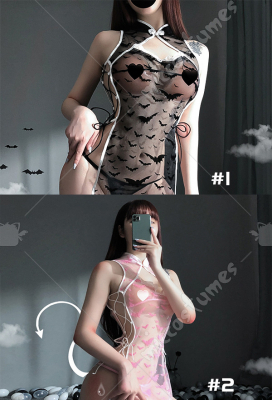 Women Lace-up Transparent Cheongsam Lace Decorated Open Chest Sexy Pajama Set