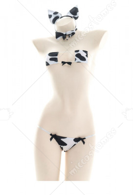 Women Sexy Cow Pattern Two-Piece Cube Tube Top Maid Bikini Bodysuit Pajama Outfit Cosplay Costume with Bowknot Hairband