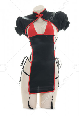 Sexy Black and Red Cheongsam Chinese Style Short Dress Chest Open High Slit Straps Two Piece Lingerie Puff Sleeves Sleepwear