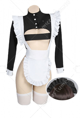 Woman Dark Style High-Slit Maid Dress Set Lingeries Costume Outfit with Headdress Stockings