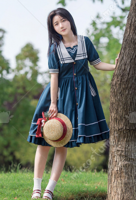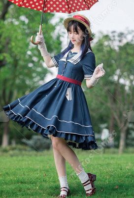 With Puji Clear Sky Sweet Square Collar Blue and White Contrast Navy Style Short Sleeves OP Lolita Daily Dress Outfit with Bow