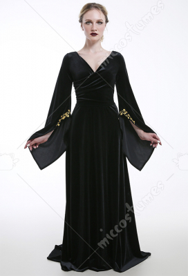 Medieval Costume Handmade Retro Gothic Halloween Carnival Witch Hooded Velvet Dress with Double Layers Gauze Sleeves