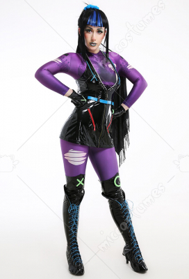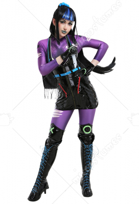Rebirth Asian Punchline Henchwoman Underboss Joker's Girlfriend Cyberpunk Halter Black Dress Jumpsuit Bodysuit Full Set Cosplay Costume with Gloves and Scarf