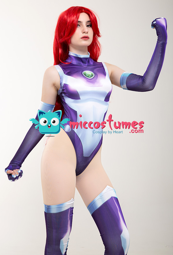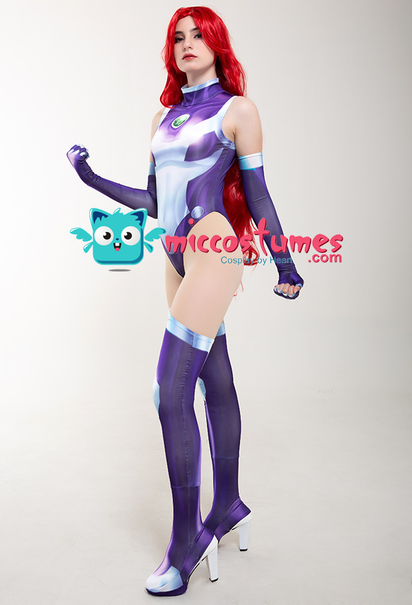 The costume includes bodysuit, gloves, shoes cover. It is made of spandex. This 3D Printed Super Heroine Cosplay Bodysuit Costume is Inspired by Starfire. Order to Made. It is not an official DC Comics product, not approved by or associated with DC Comics, but carefully manufactured by KISIBE Studio.