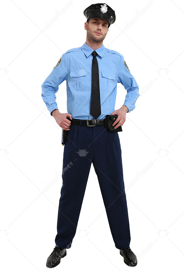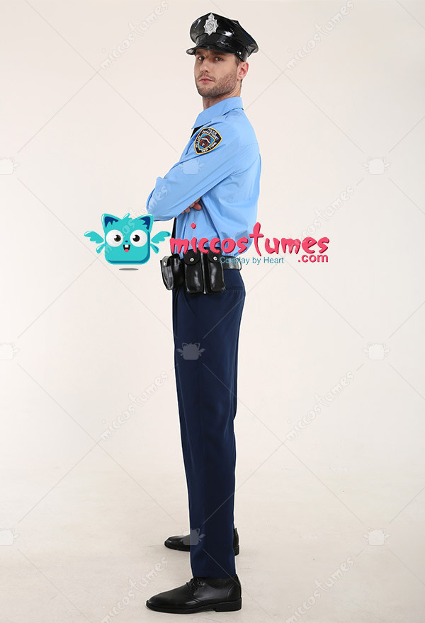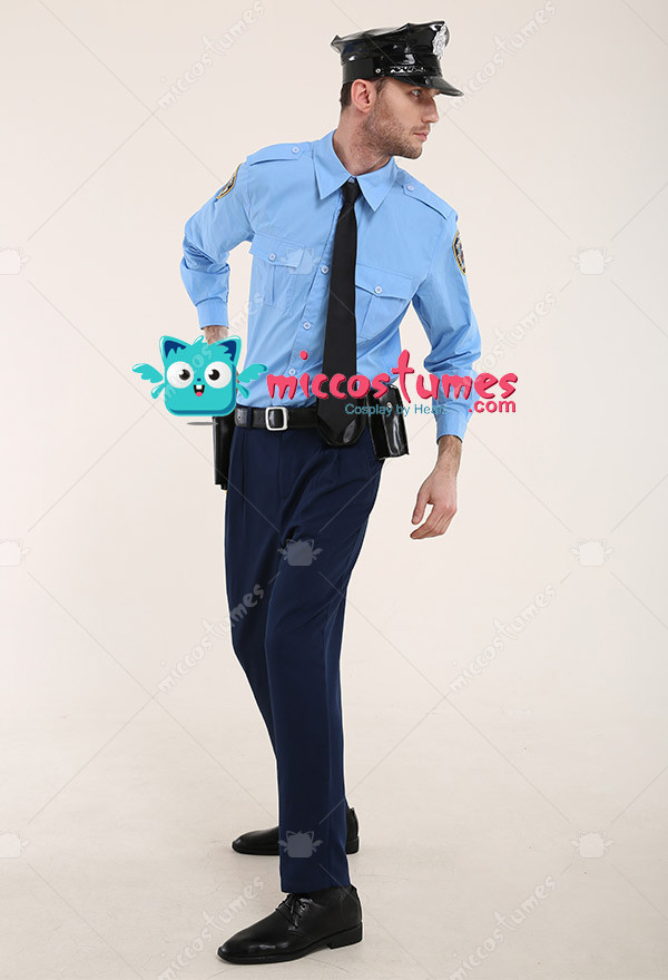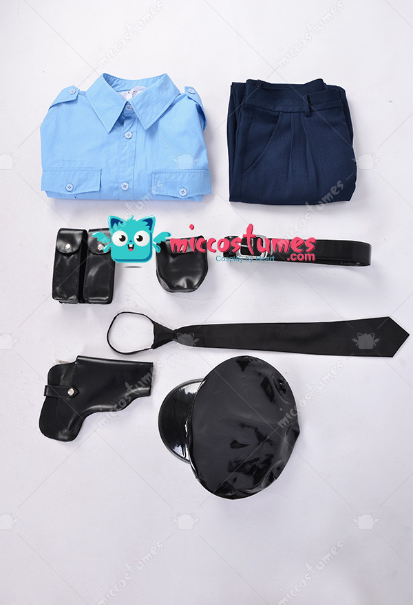 The costume includes top, pants, hat, belt, holster, walkie talkie case, handcuff case, tie. It is made of PU leather, uniform cloth, polyester, imitation tencel fabric, EVA.