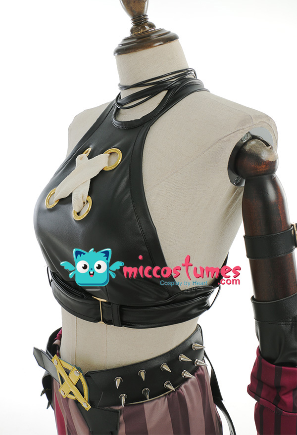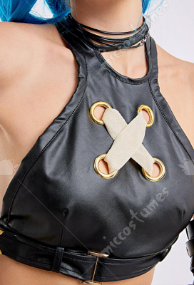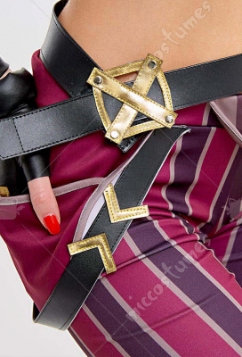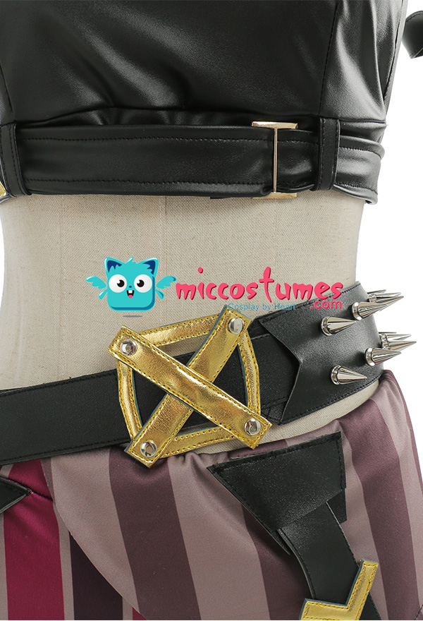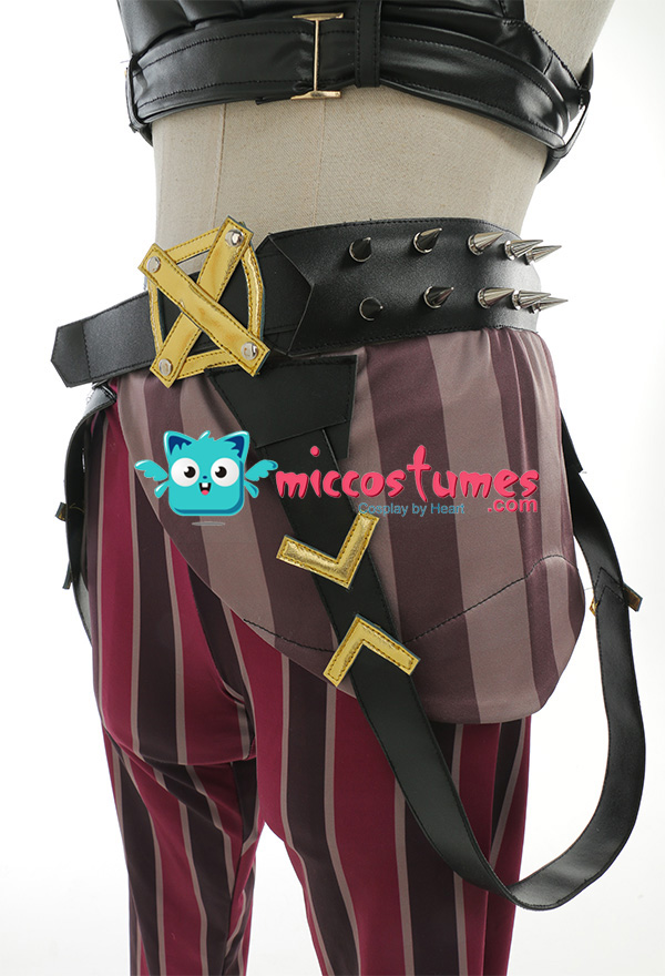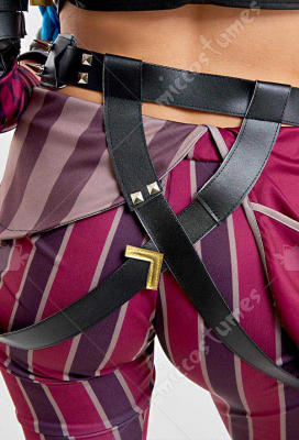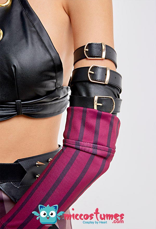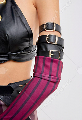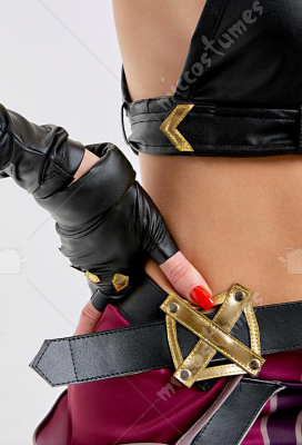 Metal leather and elastic leather are largely used in producing this costume to make it more similar to that of the original role. The top is made of black matte leather. The pants are made of printed satin fabric. It can be washed and its color will not run in the wash. The belt is provided with many rivets to make it better designed. This costume comes with all necessary accessories such as wrist accessory and neck accessory. The top collar is provided with a velcro design to make it easier to put on and take off. The pants are of an elastic design.