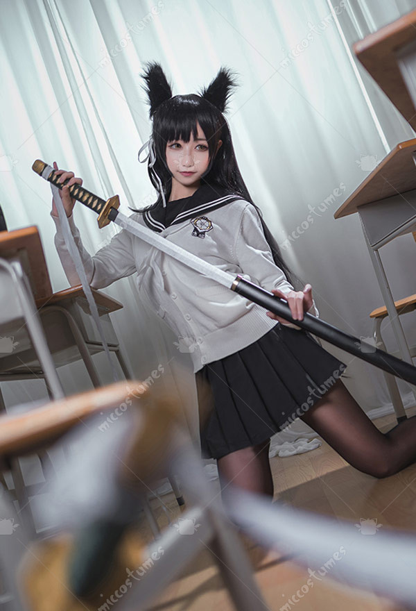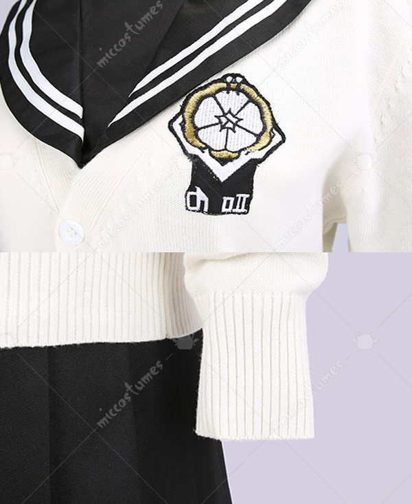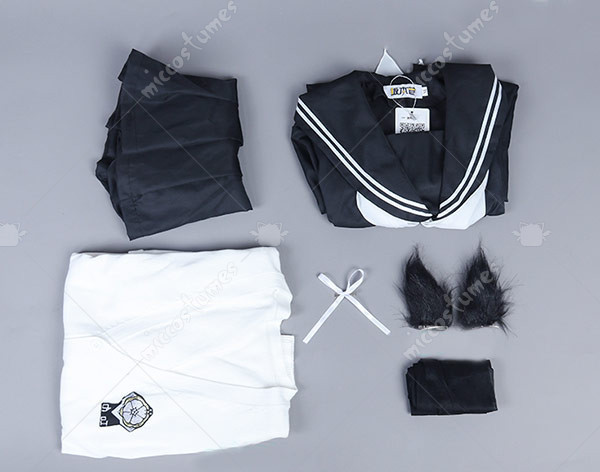 The costume includes shirt, skirt, sweater, ear*2, stockings, ribbon. It is made of polyester.