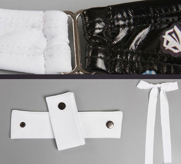 The costume includes bikini top, bikini briefs, wristband*2, coat, bowknot, leather stockings, stockings. It is made of chinlon. Please note whether you choose 68cm stockings or 78cm stockings.