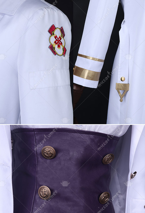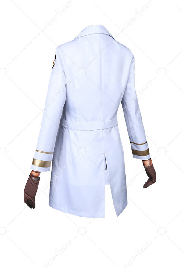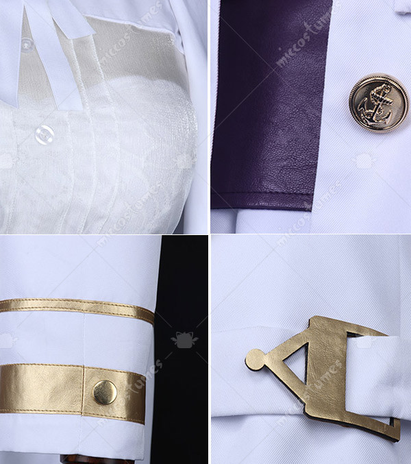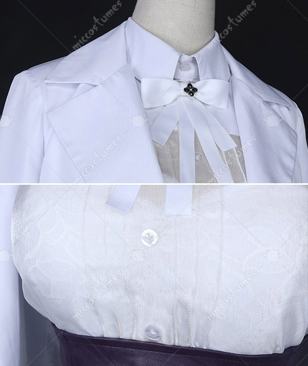 The costume includes hair clip*4, hair strap*2, head accessory*2, bow tie, top, belt, string, glove*2, coat, skirt. It is made of polyester, PU leather, lace.