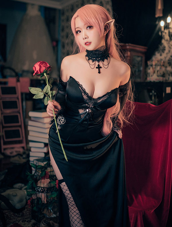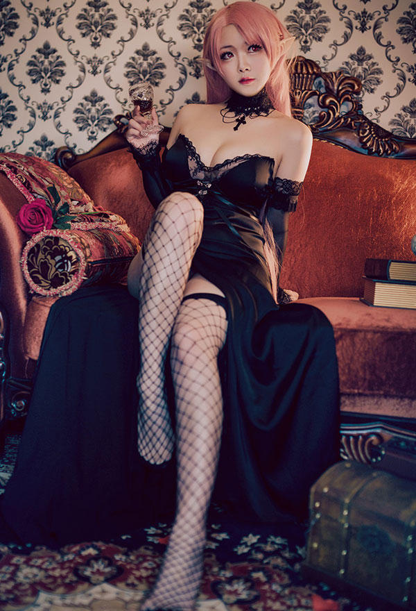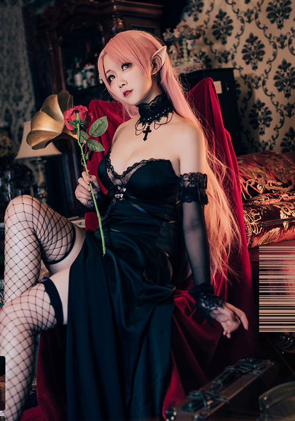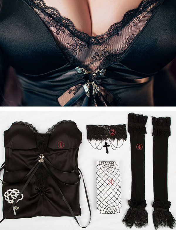 The costume includes dress, sleeves, choker, fishnet stockings. It is made of satin and lace fabric.