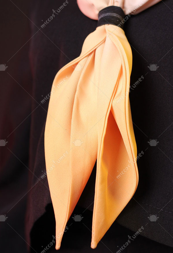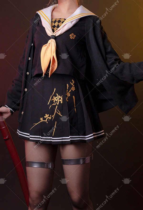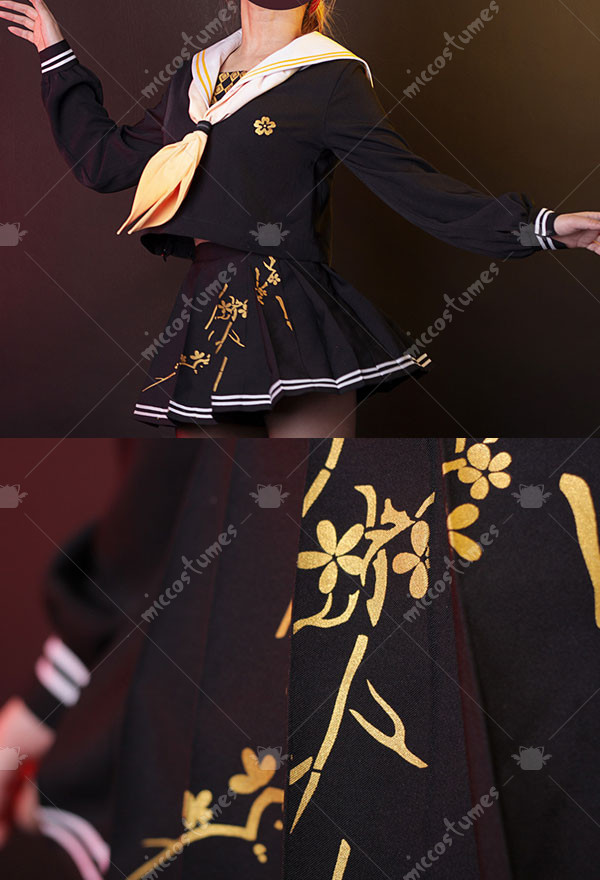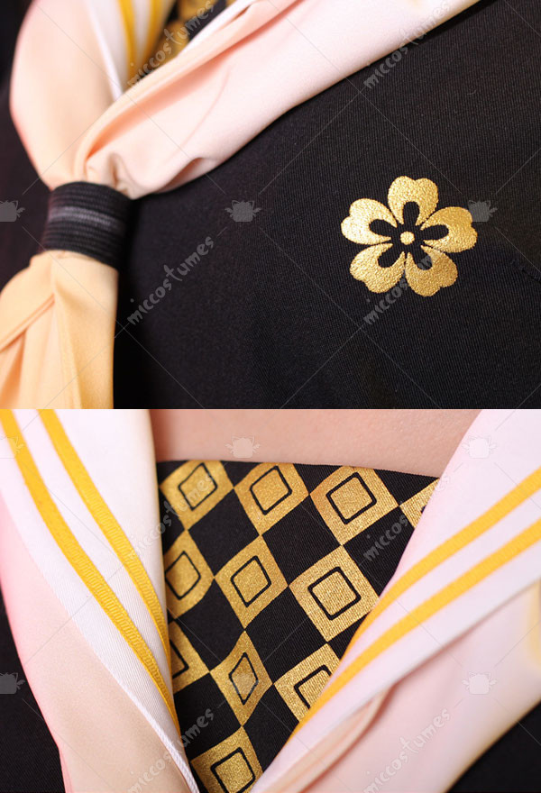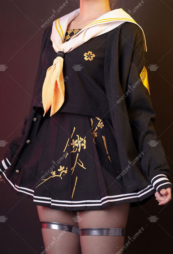 The costuem includes top, skirt, tie, stockings, sweater, thigh ring*2, scarf. It is made of printing fabric.
