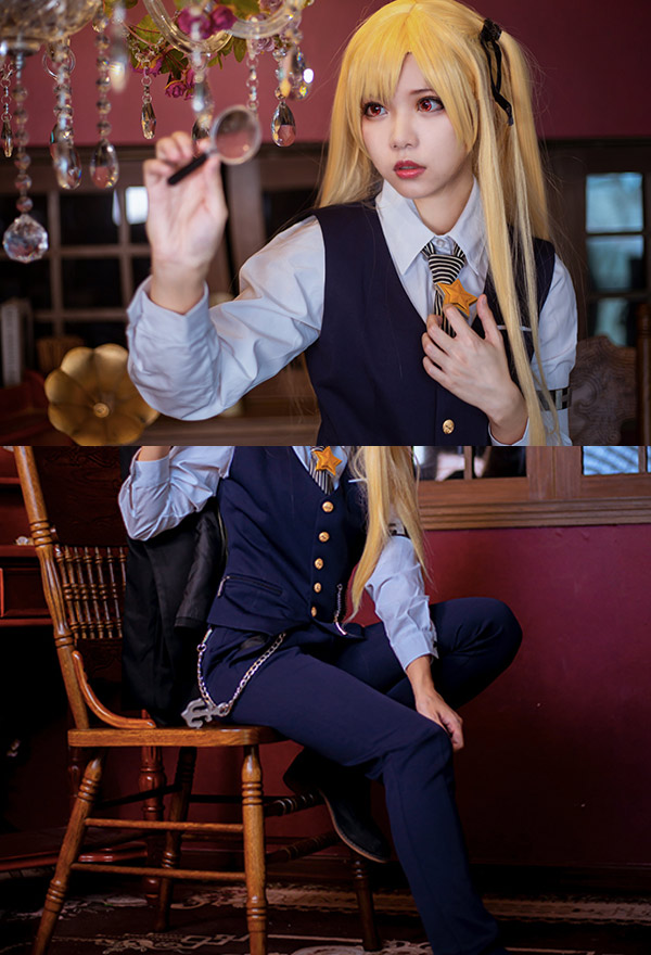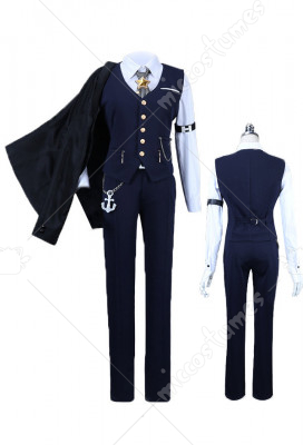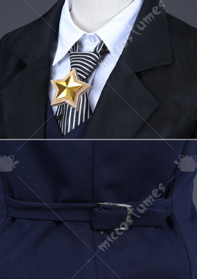 The costume includes head accessory, shirt, vest, tie, tie ddecoration*1, tie clip, arm ring, waist chain accessory, pants, pants chain accessory, coat. It ia made of polyester fibre, satin, leather.