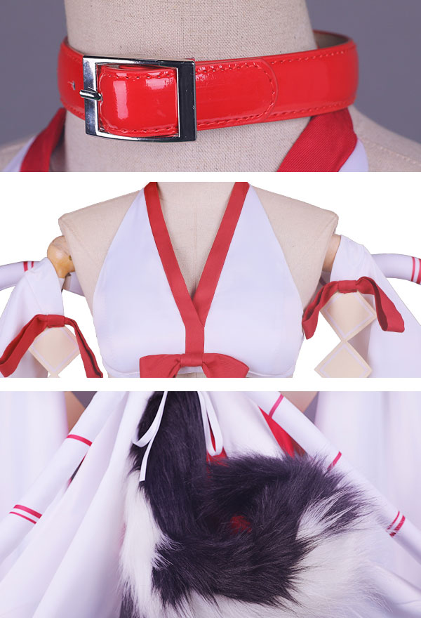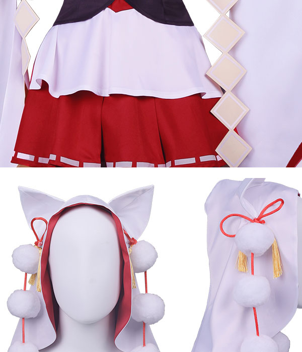 The costume includes top, sleeve*2, skirt, sleeve decoration*2, hat, choker, white belt, black waistband, apron, ribbon, bowknot, tail, tassels, socks, anklets. It is made of satin and elastic fabric.