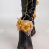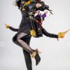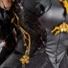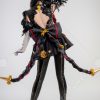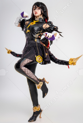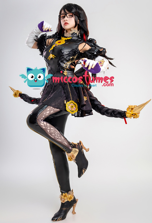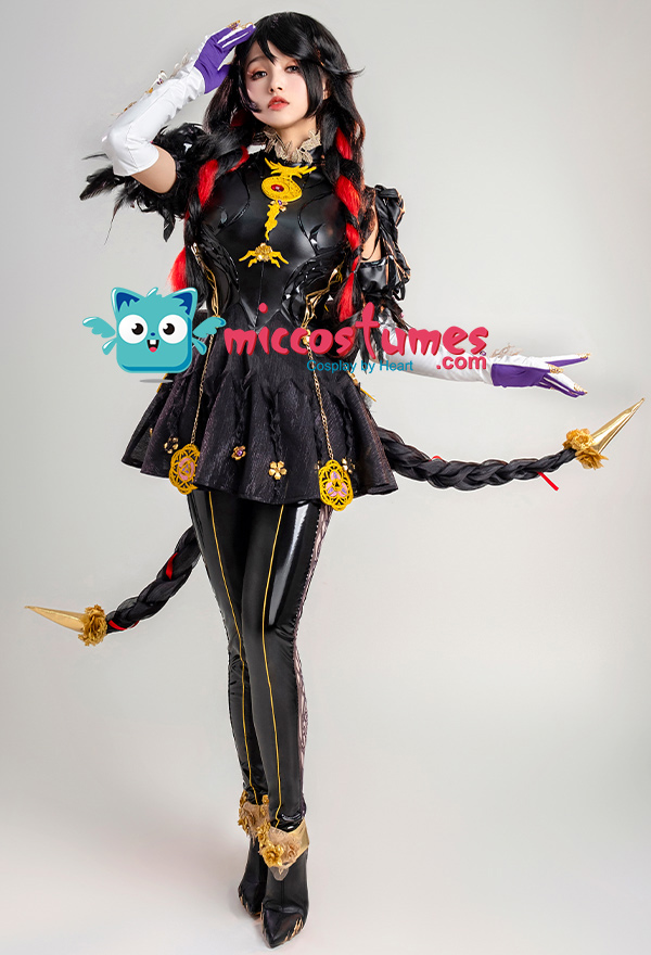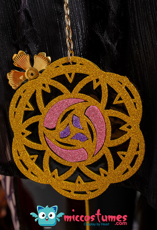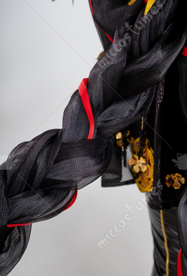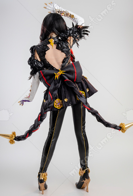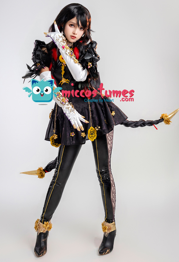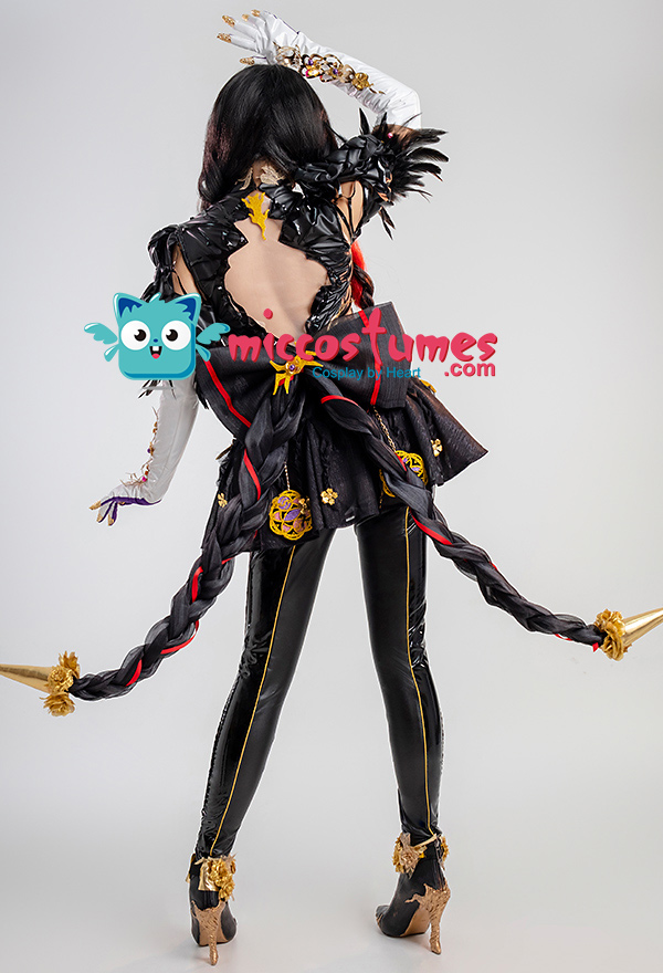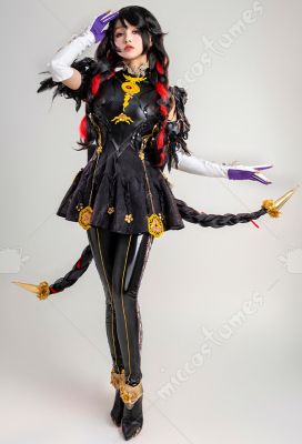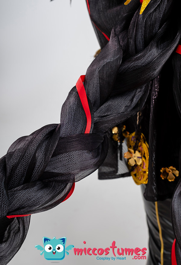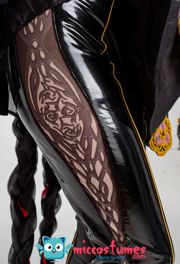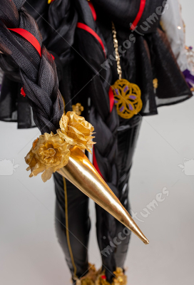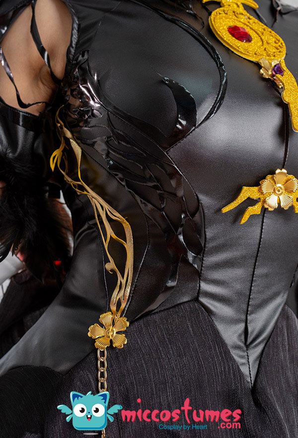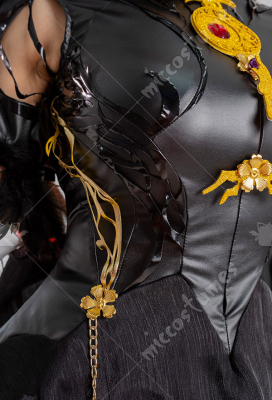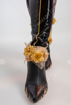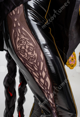 Design Details: Designed according to the game characters, restoring the whole body pattern. Most of the accessories are made of EVA material to prevent breakage. The costume is decorated with a lot of metal flowers, and the back is hollowed out and mesh is added to make it more close-fitting. The side of the trousers is designed with spandex screen printing to restore the hollow pattern, and the whole is made of elastic PU leather, which is more close-fitting.