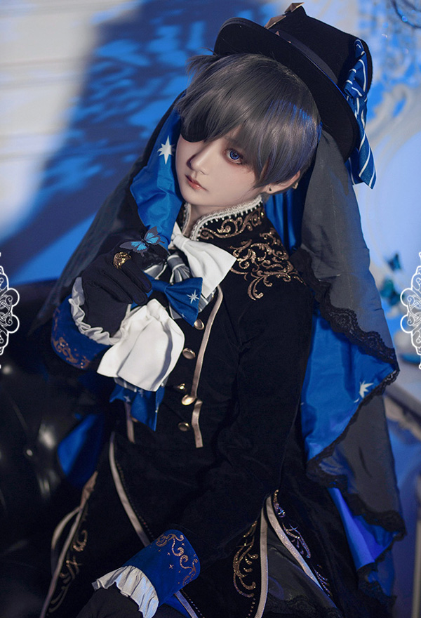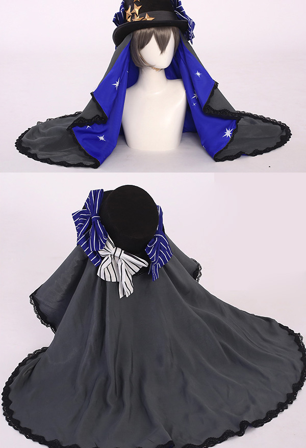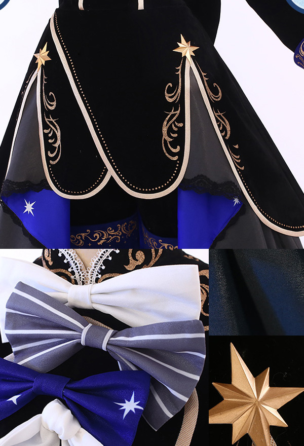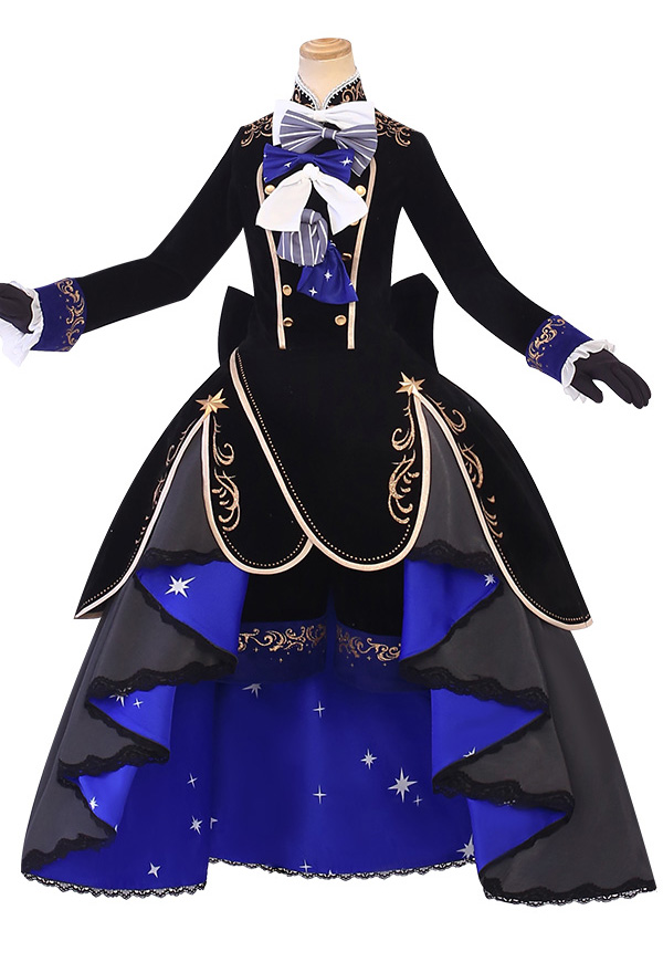 The costume includes hat, shorts, dress, veil, petticoat, chest accessory, back bowknot, glove*2, stockings, ring, eye patch. It is made of chiffon, satin, velvet fabric.