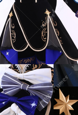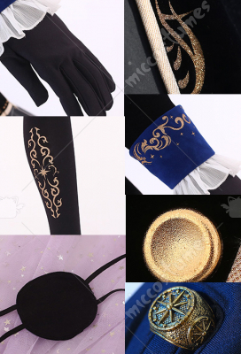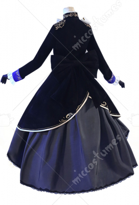 The costume includes hat, shorts, dress, veil, petticoat, chest accessory, back bowknot, glove*2, stockings, ring, eye patch. It is made of chiffon, satin, velvet fabric.