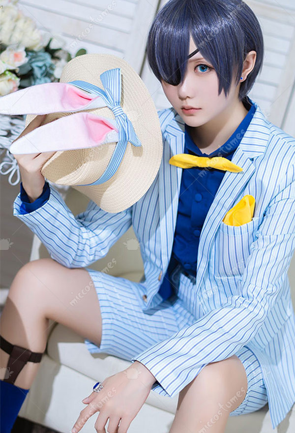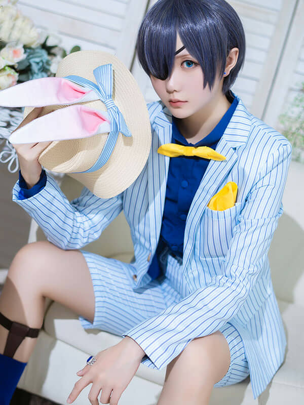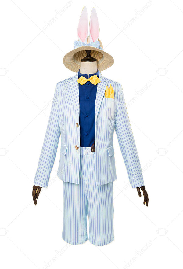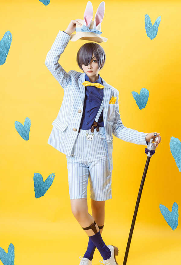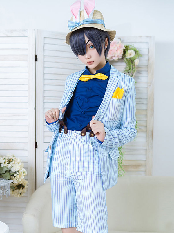 This costume includes shirt, coat, shorts, straps, handkerchief, neckline bow, socks, hat, blindfold. It's made of shirt fabric uniform cloth, wedding satin, knitted fabric and leather.