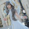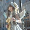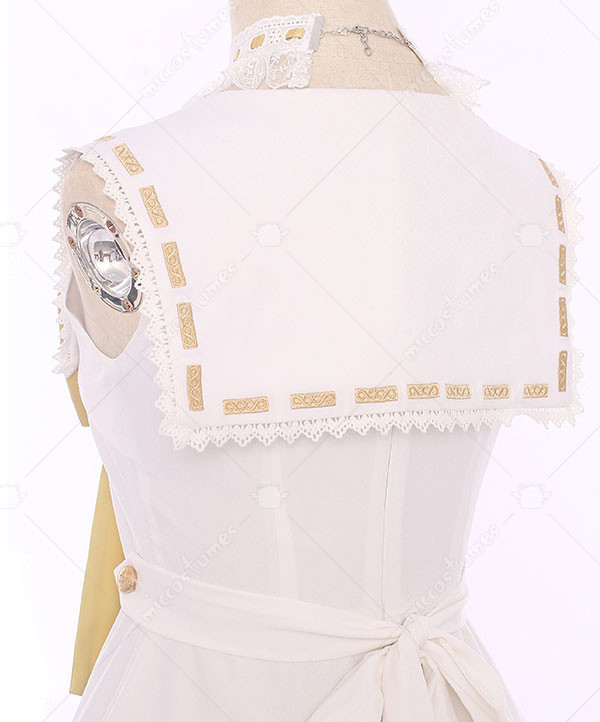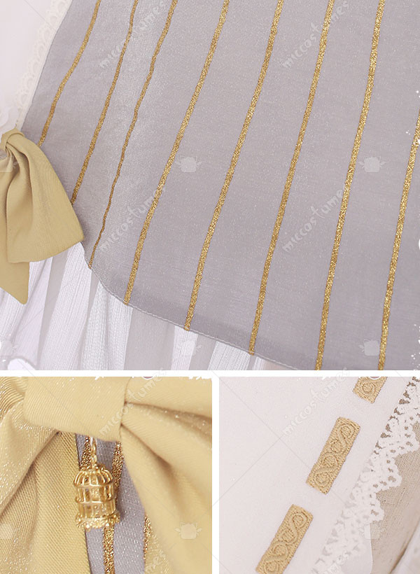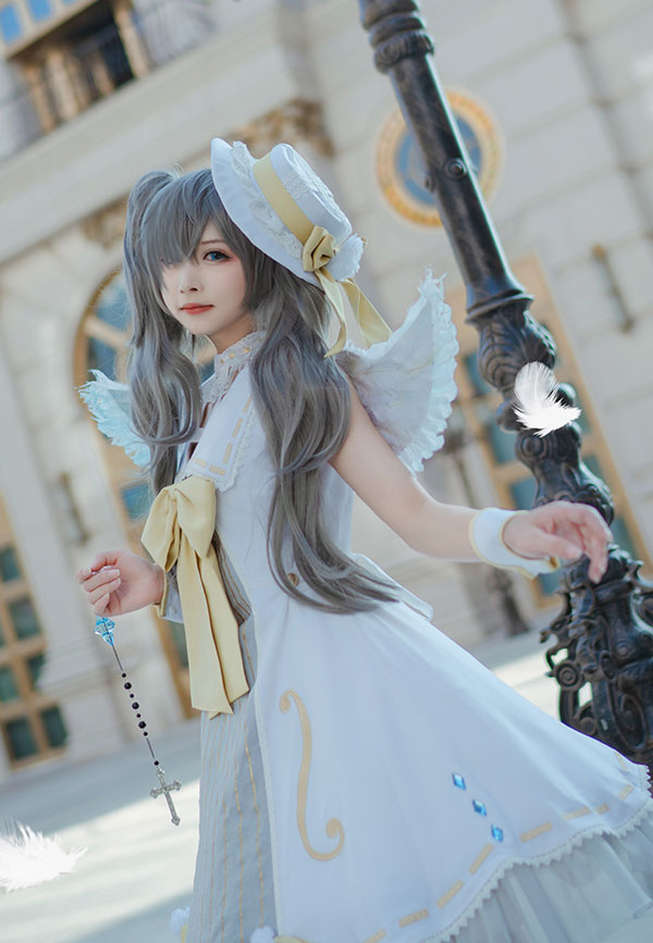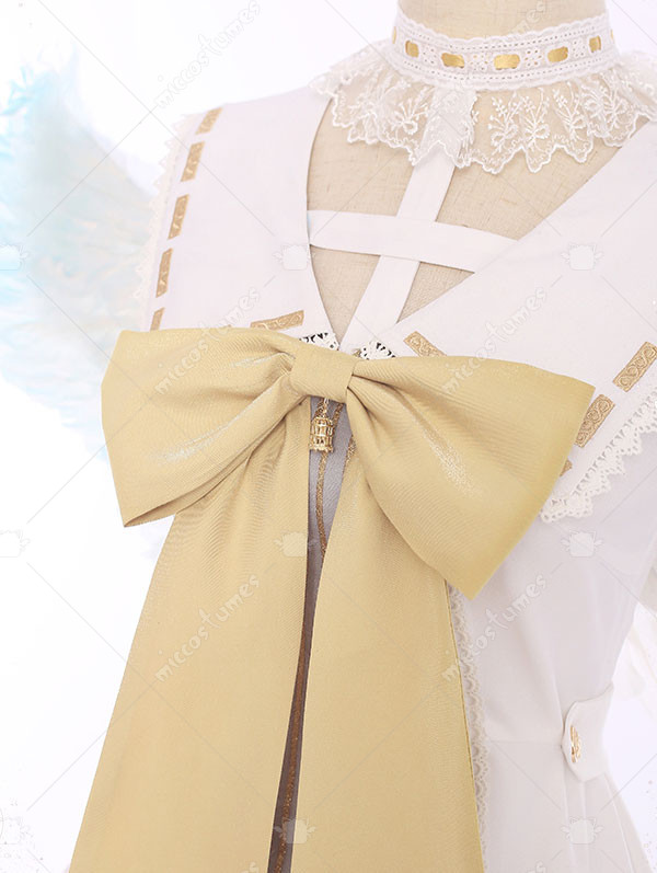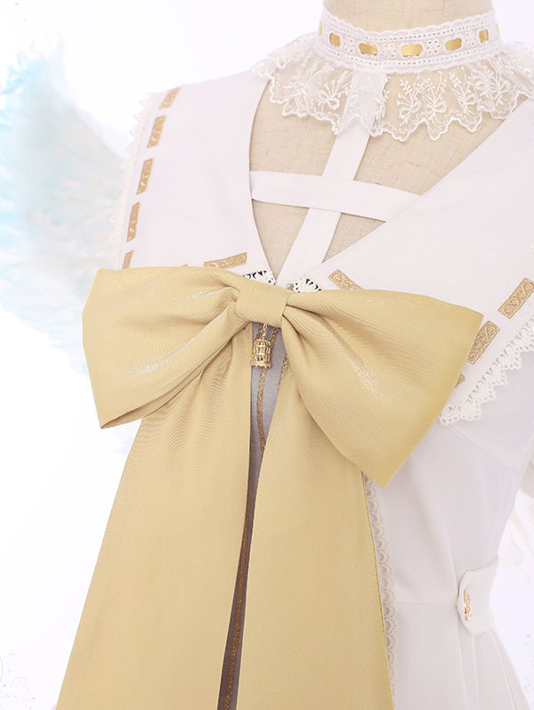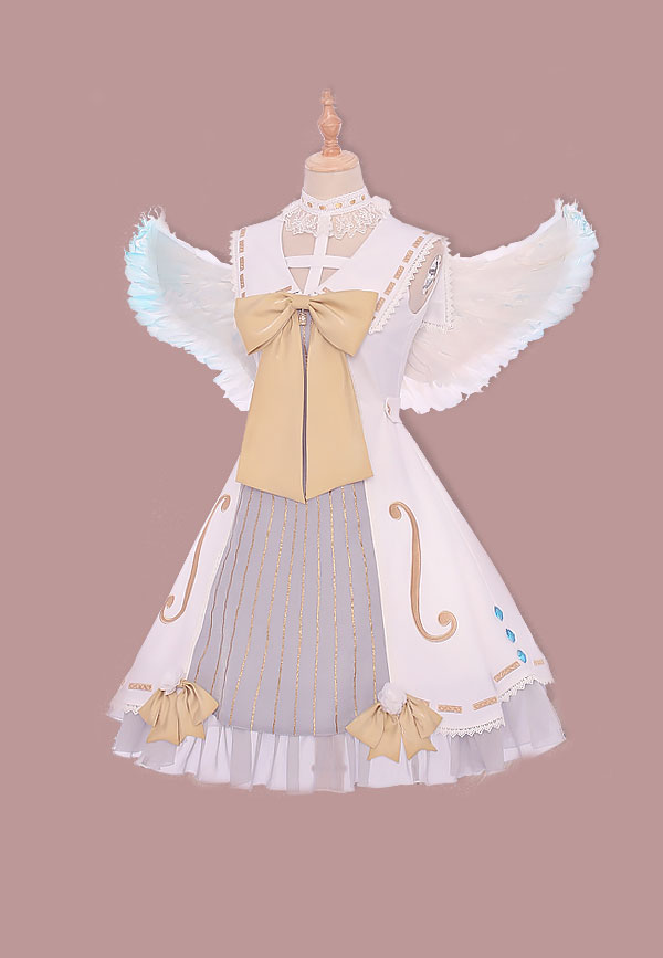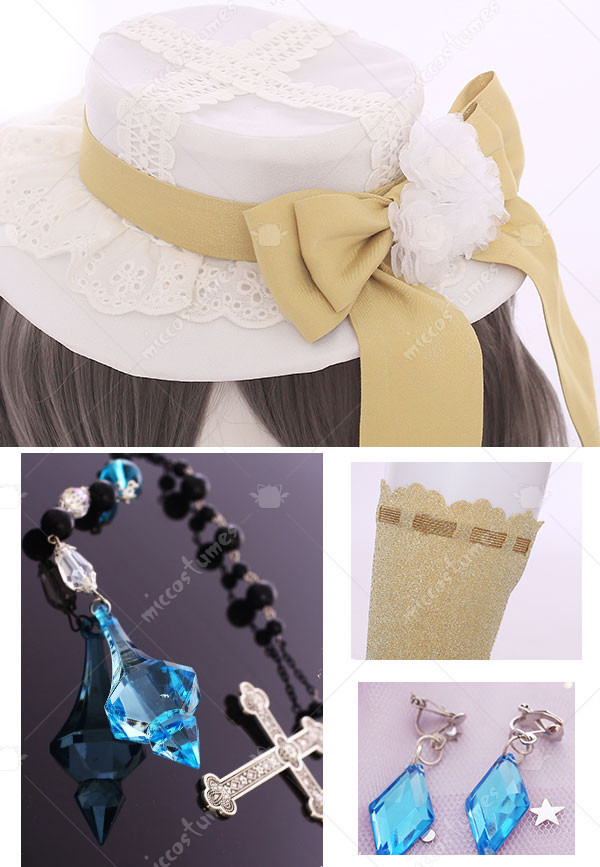 The costume includes hat, wrist band*2, chest bow, earring*2, neck band, socks and dress. Wings and cross are separately selled. It is made of corduroy and lace.