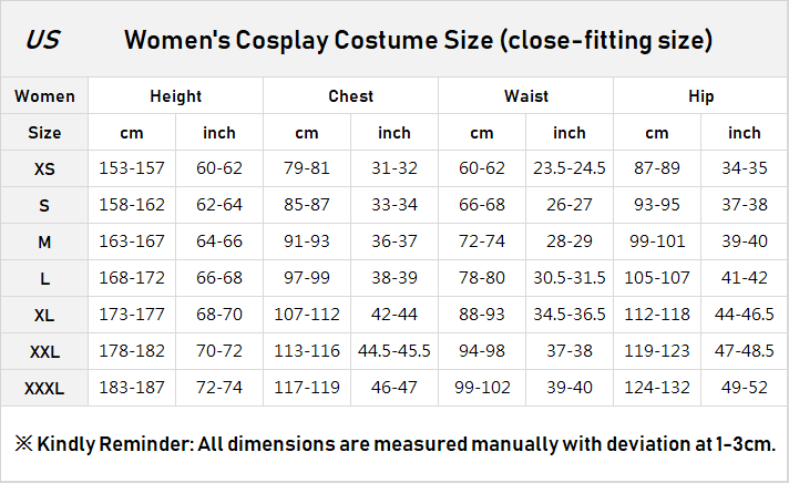 1)Our costumes are made in a variety of different materials with specialized stitching and parts, so your usual size will not apply here.