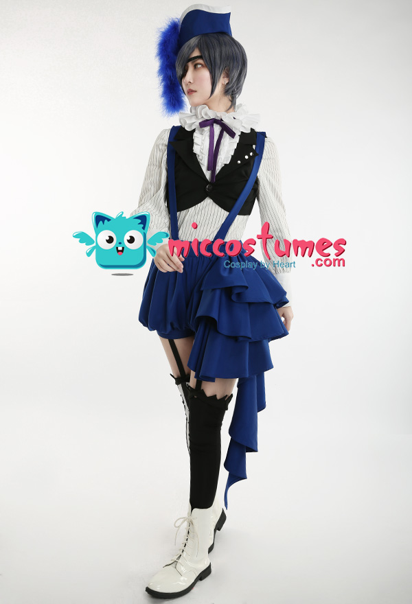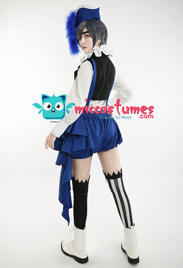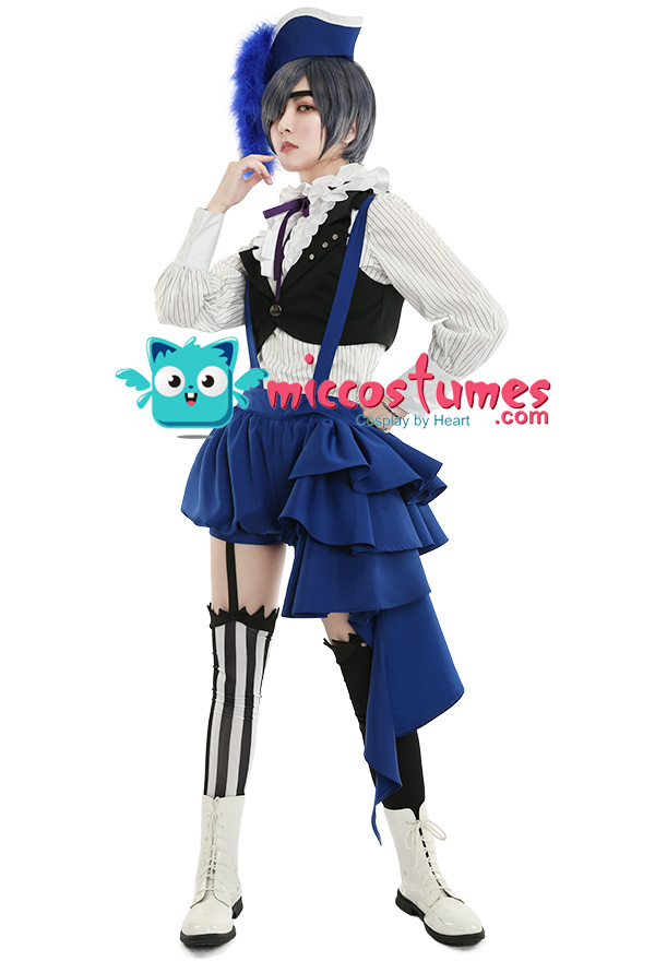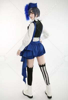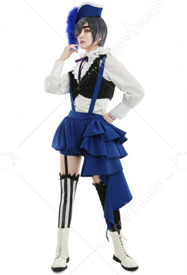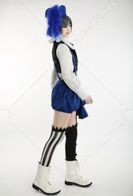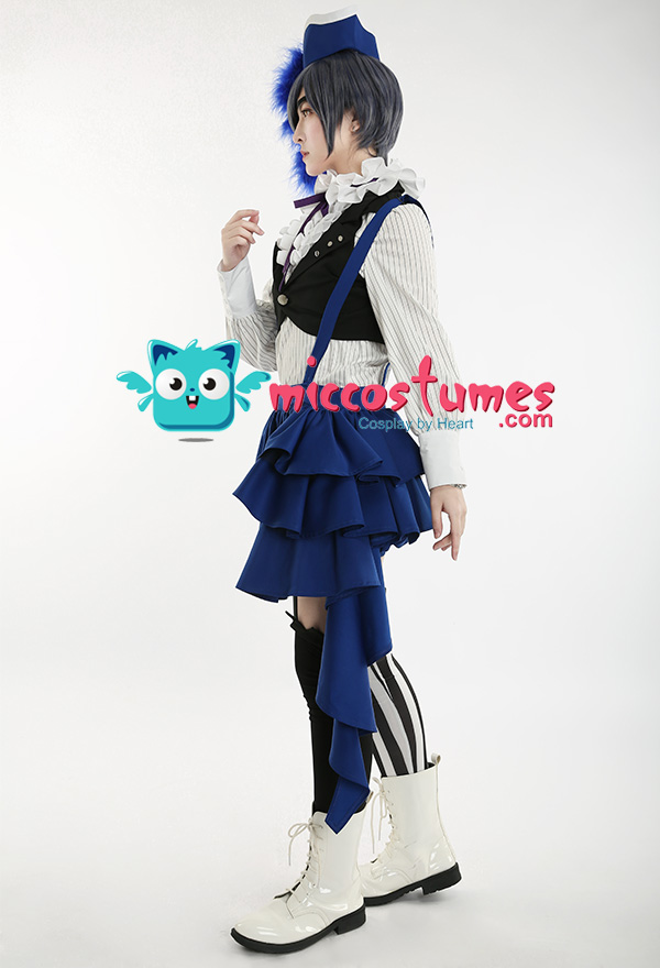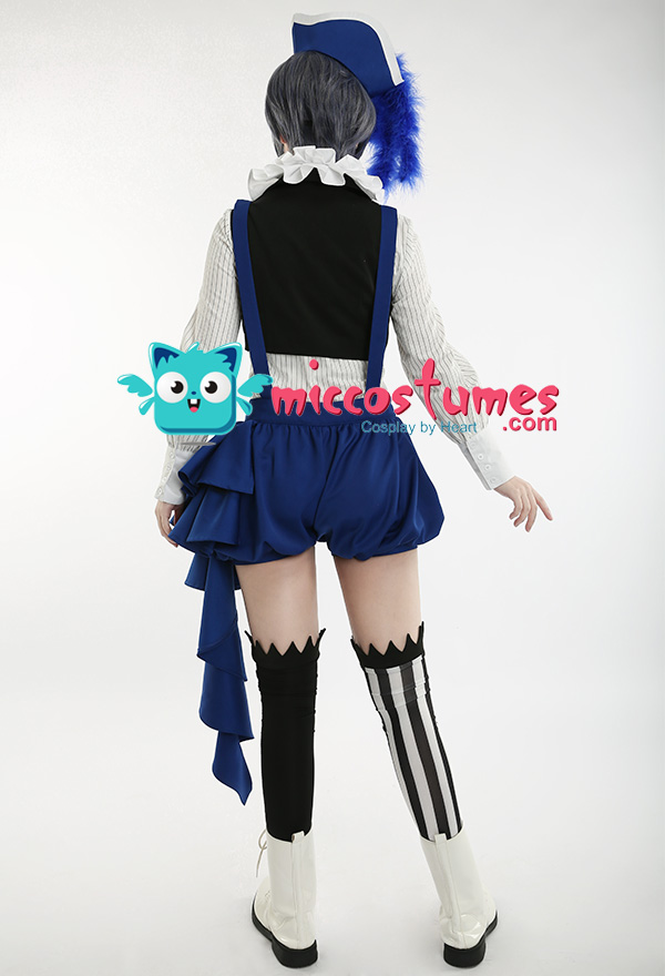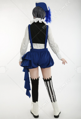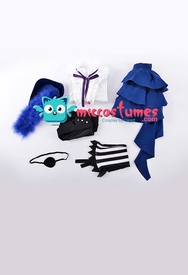 The costume includes shirt, vest, suspender trousers, hat, eye patch, stockings*2. It is made of spandex, cotton, turkey fur, lining, polyester.