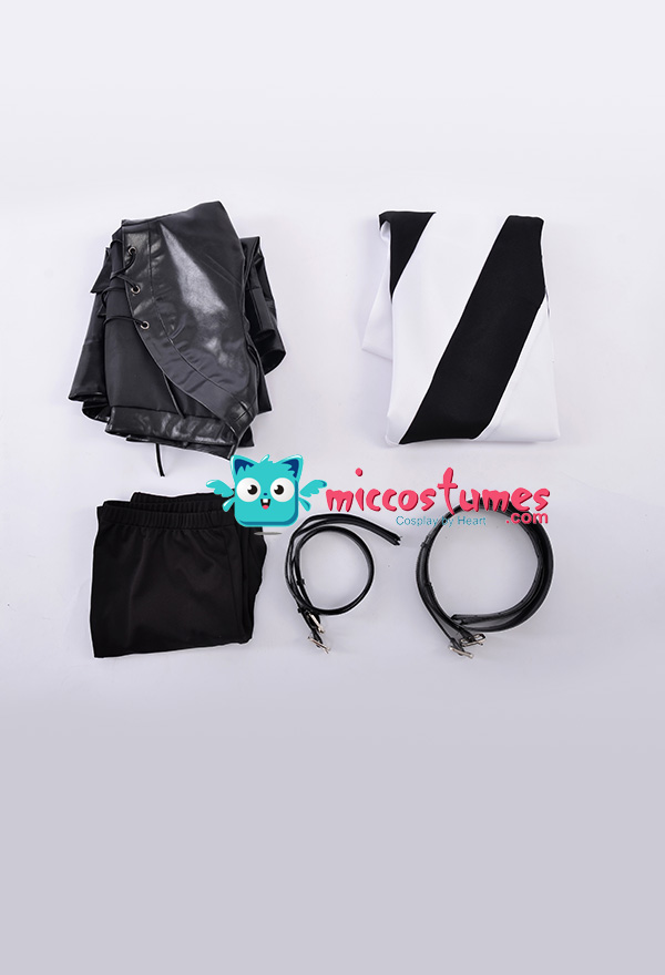 The costume includes base shirt, short top, belt, pants, choker*2. It is made of spandex, PU leather, uniform cloth.