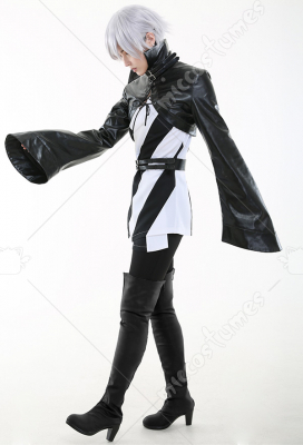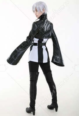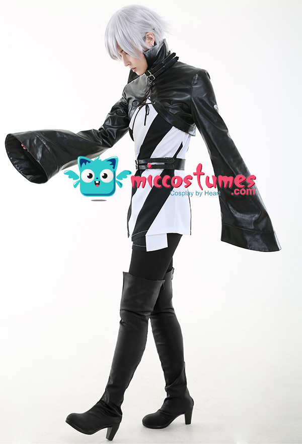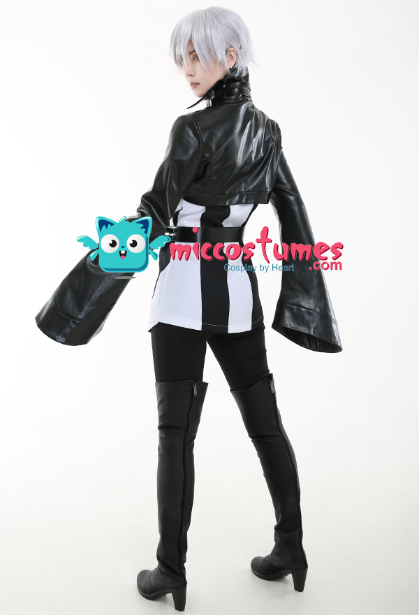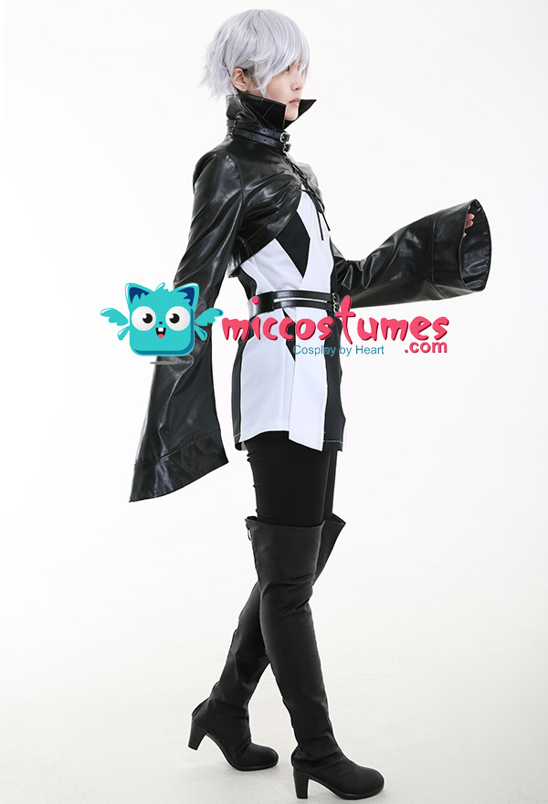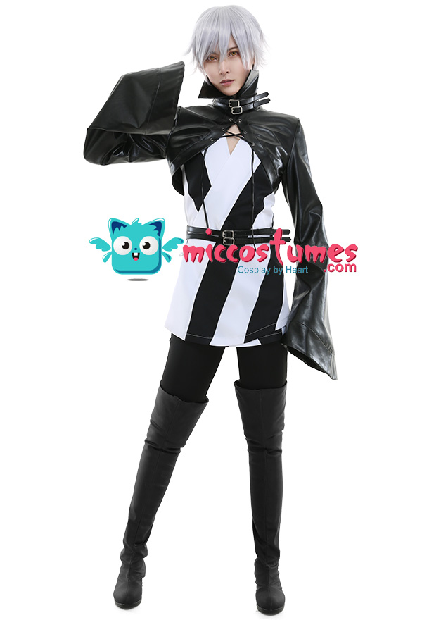 The costume includes base shirt, short top, belt, pants, choker*2. It is made of spandex, PU leather, uniform cloth.